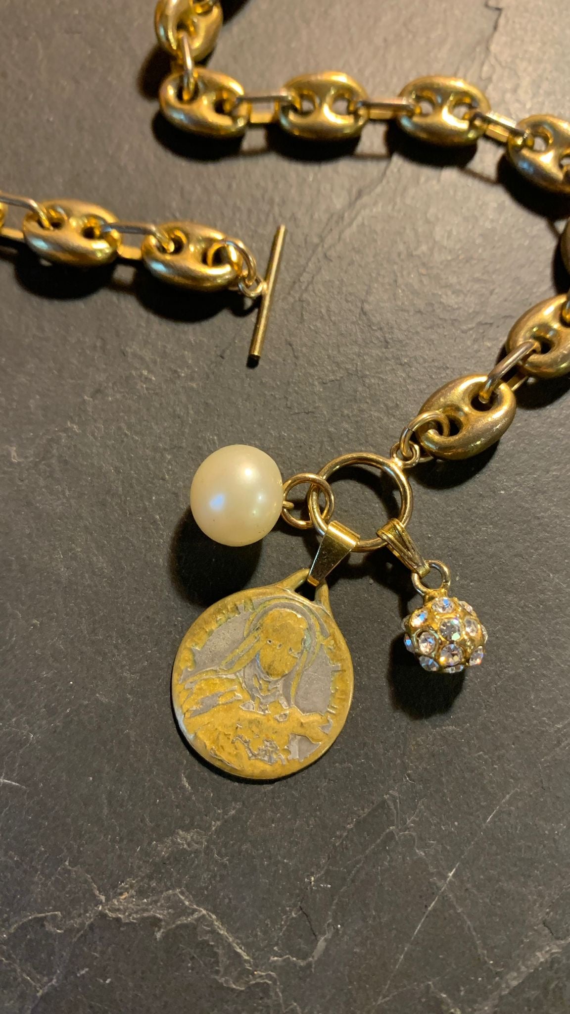 Necklace made from a mottled chain with coffee bean mesh in gilded brass, combined with an old corsage pearl, a vintage 90s rhinestone ball, and a silver-plated brass medal representing St. Thérèse, very patinated. Length 45cm